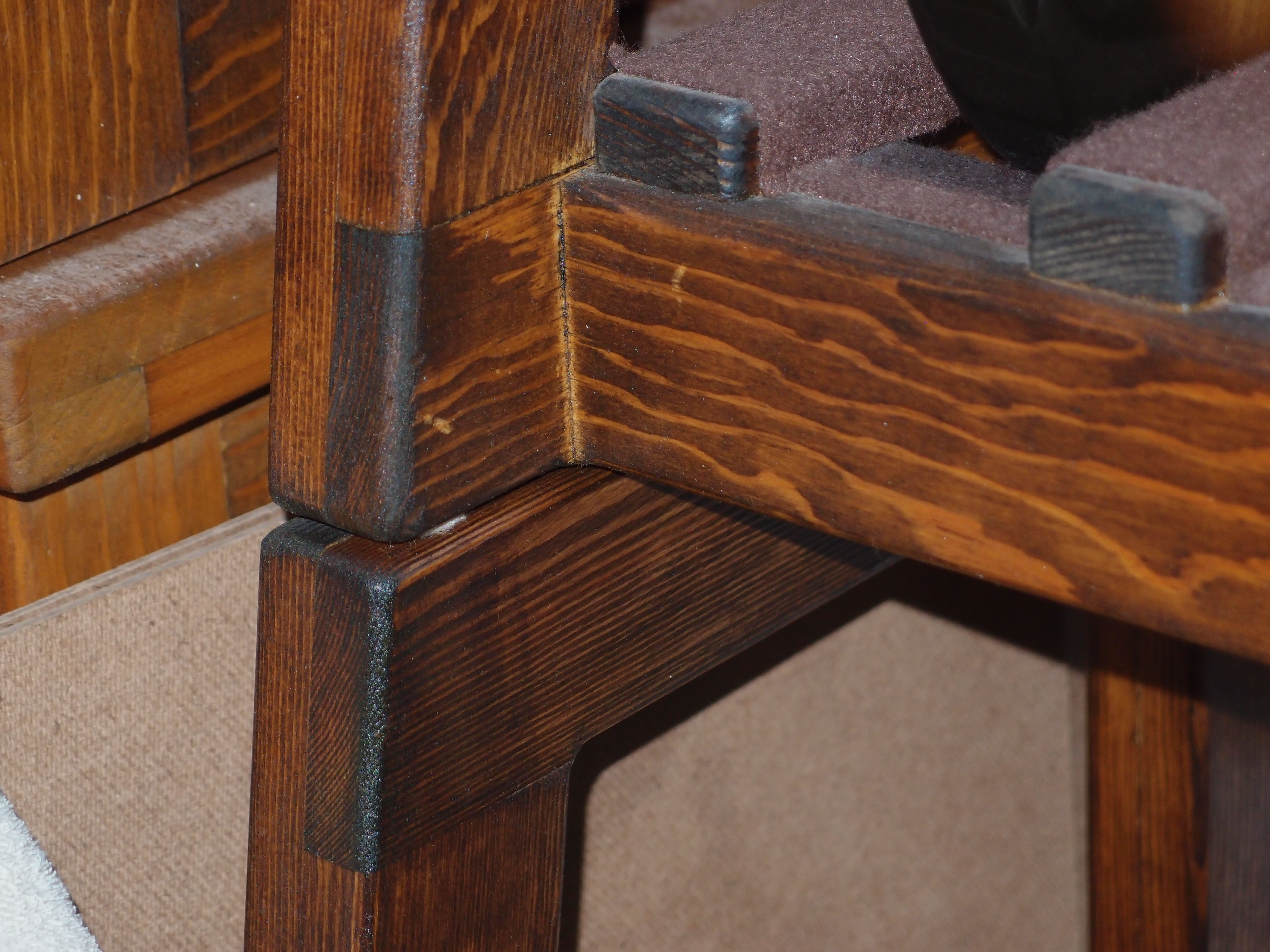 The main frames are now just about done, and ready for finishing. Take a final look over everything and scratch-up any places that still need scratching. Then you can stain it. The scratched surface will drink up stain, and the result will be a lot darker than the can indicates, so you might want to do some testing on scratched-up scrap first. Pre-stain is also useful - it plugs-up the wood a little and makes the stain go on lighter.