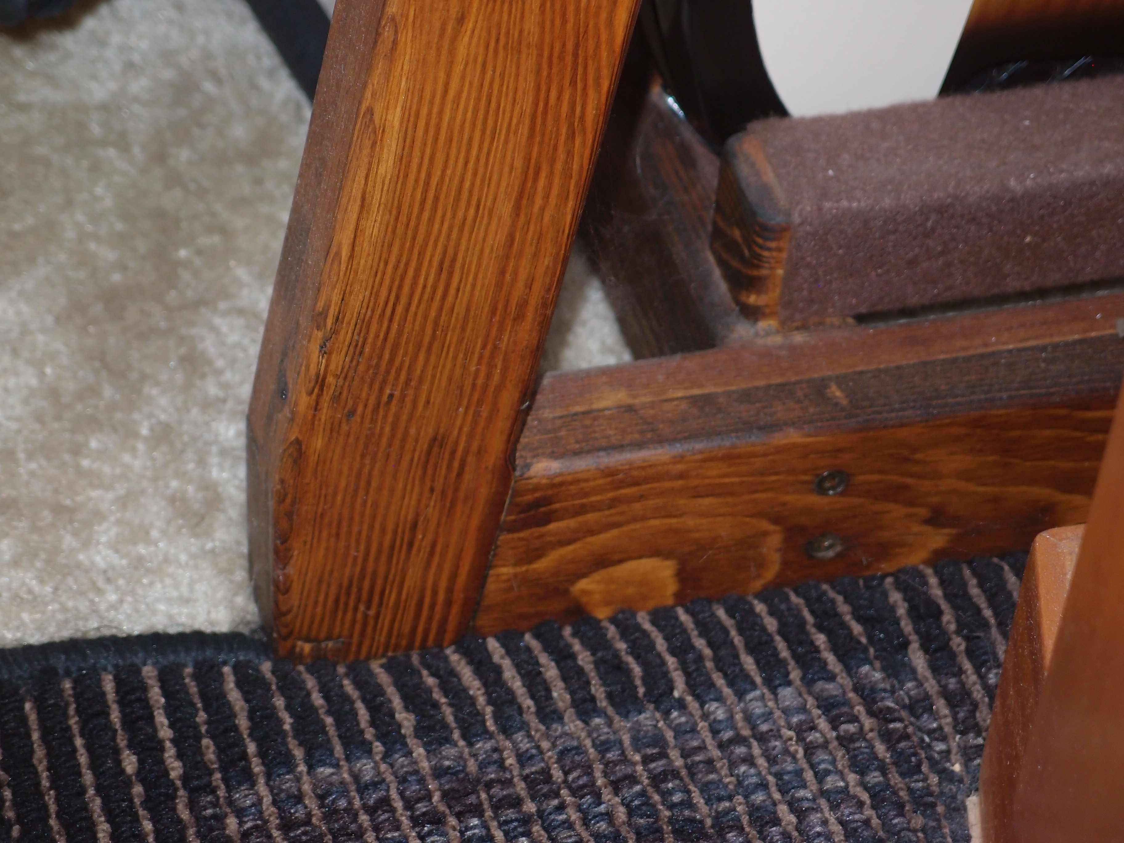 The main frame joints are all glued lap joints. Below are some detail photos. The camera flash makes everything look ugly, under normal lighting these are actually quite nice pieces that your wife would probably still want in the basement. Also, these racks are around ten years old now and have been knocked-around a bit and haven't been cleaned in a while.