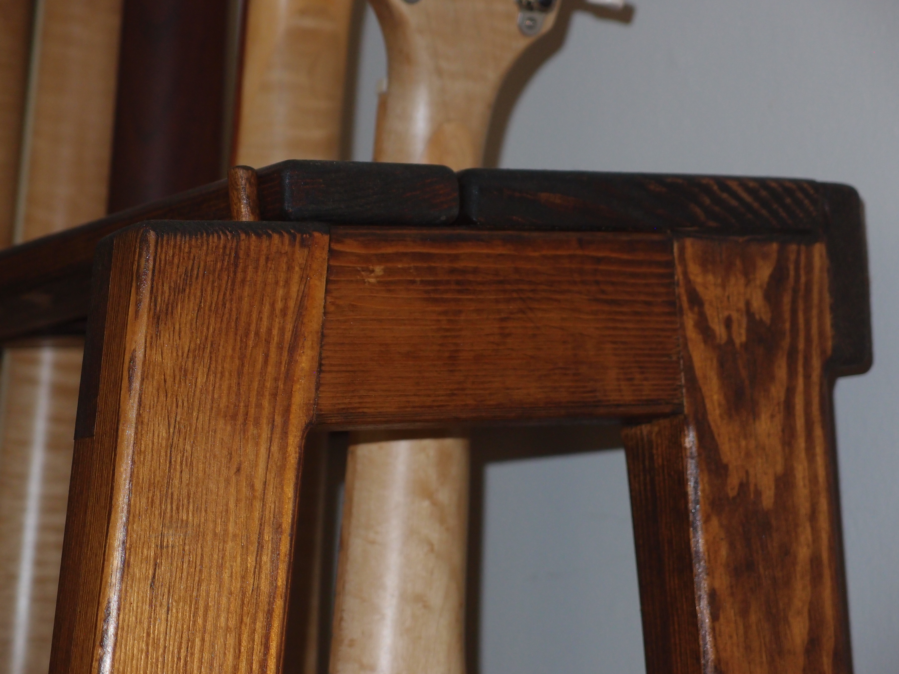 The smaller single-tier guitar racks (above) were a modification of a standard sort of stackable little bookshelf that I have built quite a few of. The larger two-tier racks (below) were based on a similar sort of construction. Unfortunately, I never saved any plans for these things, in fact I never had more than rough sketches to start with, and improvised the rest. Once I worked-out all the dimensions and details for the first one, I just copied it. These racks are now a decade old, and have stood up to humid summers and dry winters perfectly. Nothing has pulled-apart or cracked.